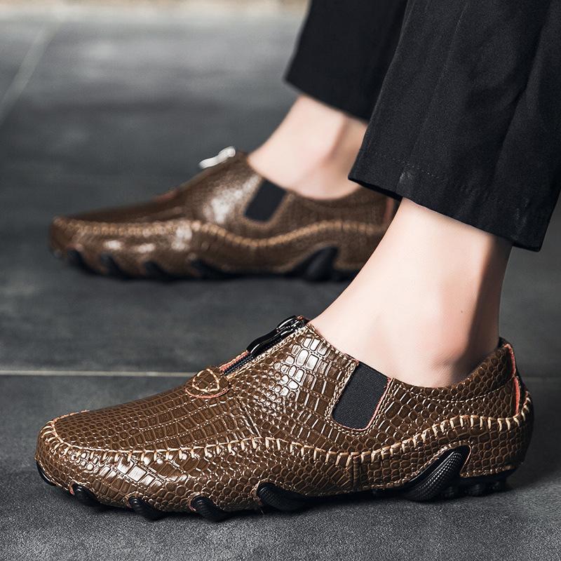 2025 Four Seasons Low-top Small Leather Shoes Front Zipper Large Size Lightweight Retro Versatile Men's Shoes Non-slip Casual Crocodile Pattern Tide