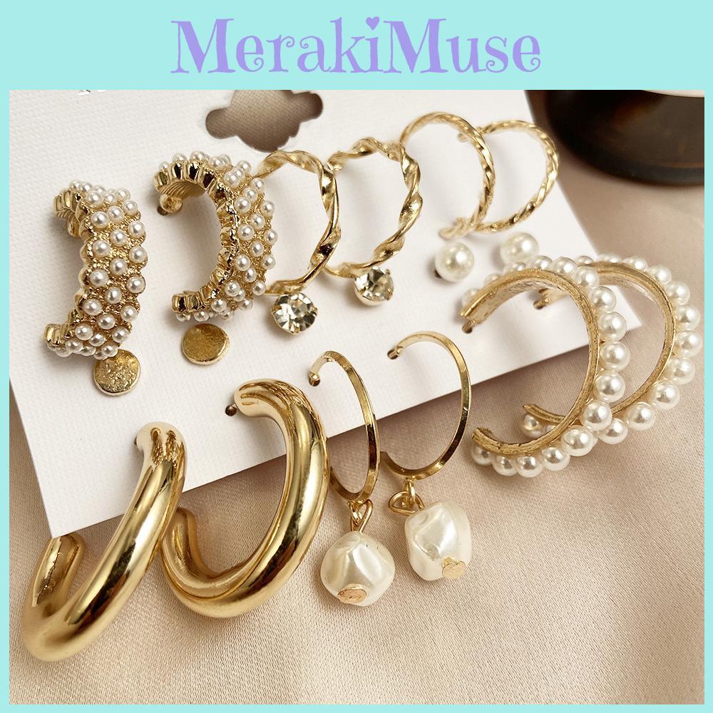 Retro French Gold Ear Ring Set With Artificial Pearl Decoration For Women