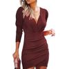 European American Hot Style Waist Slimming Solid Color V-neck Long-sleeved Tight Skirt Ethnic Style Nightclub Dress for Women