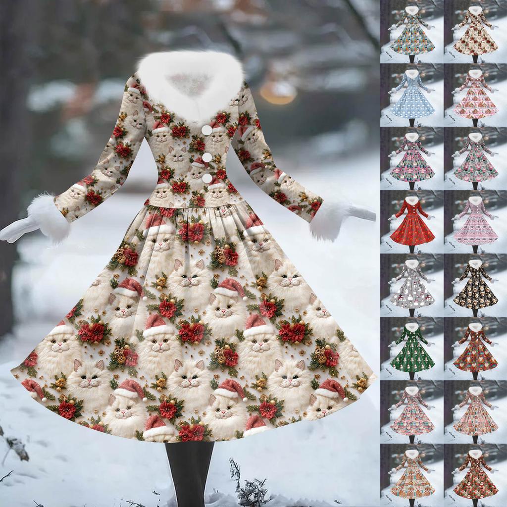Women's Casual Dress Long-Sleeve V-Neck Patchwork Fleece Christmas Print Dress