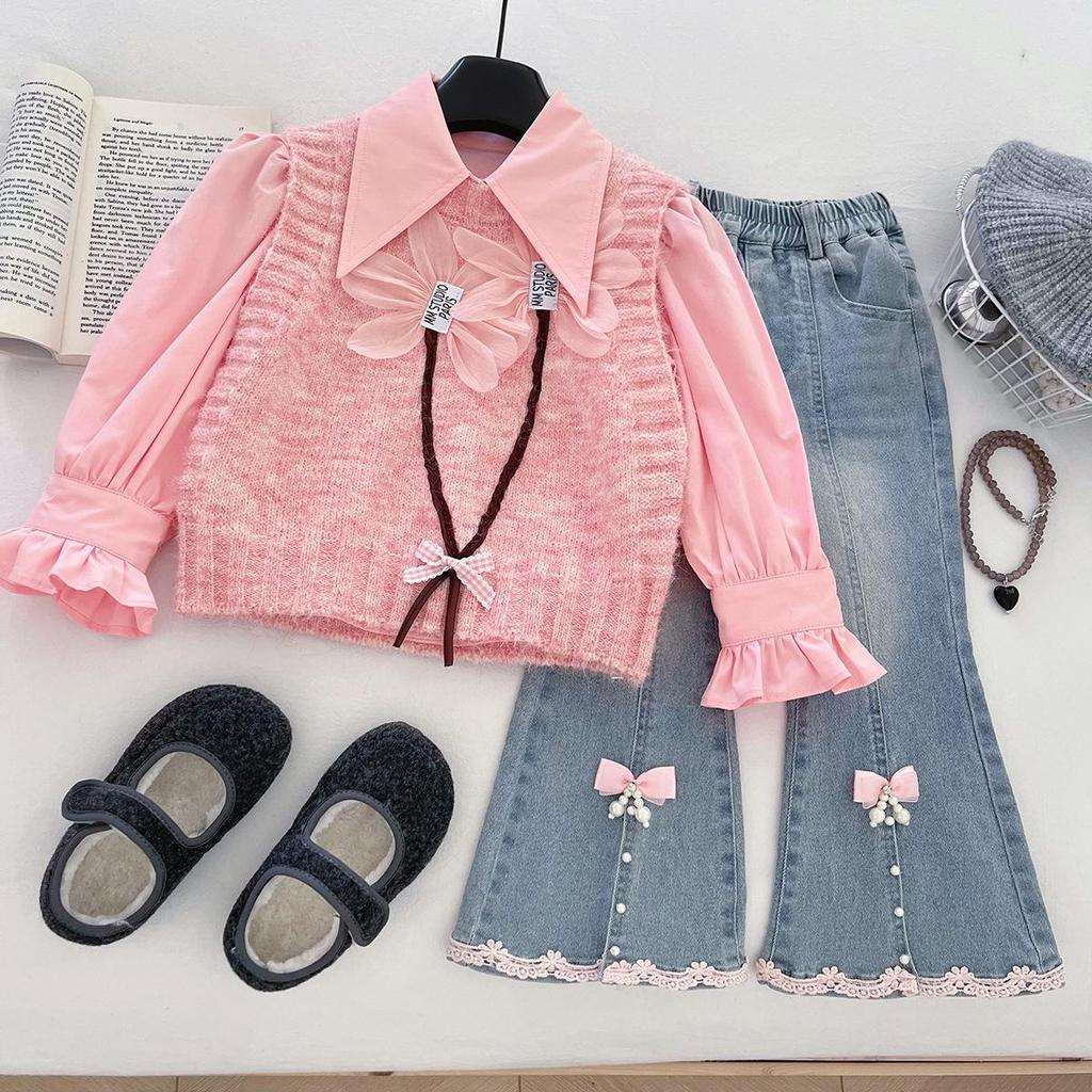 Introducing a trendy three-piece set perfect for your little one's autumn wardrobe. This adorable ensemble features a cozy wool vest, a soft long-sleeve shirt, and stylish micro-flare jeans. Crafted with a blend of high-quality cotton and polyester materials, this set ensures comfort and durability for your baby girl. The fashionable design makes it ideal for both casual outings and special occasions, offering a perfect mix of style and practicality.