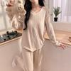 Experience comfort and style with these Korean women's pajamas, designed for plus-size figures. Perfect for spring, autumn, and winter, they feature a cozy knitted brushed material that promises warmth and softness. Made from high-quality polyester, these pajamas include a top with long sleeves and practical bra pads, ensuring support and ease. The matching pants complete this chic and functional sleepwear set, ideal for staying comfortable during cooler seasons.