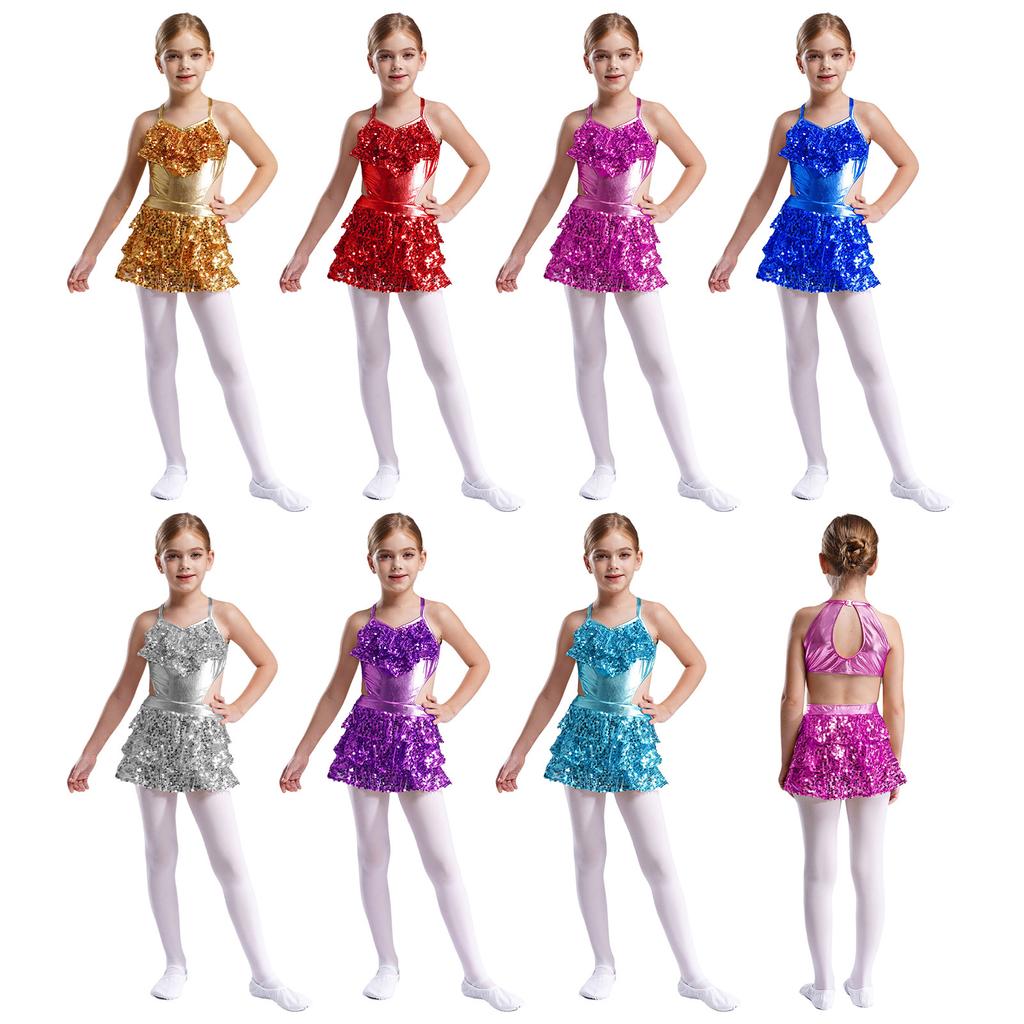Girls Performance Dress Sequined Tiered Ruffles V Neck Sleeveless Stage Dance Costume