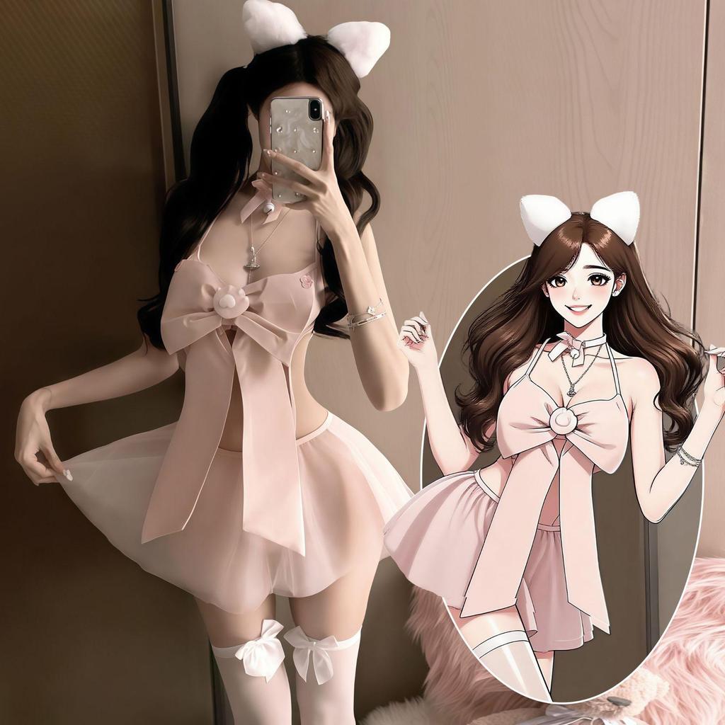 Pink Bow Three-Point Lingerie Set - Pure Desire Mesh See-Through with Quick Release