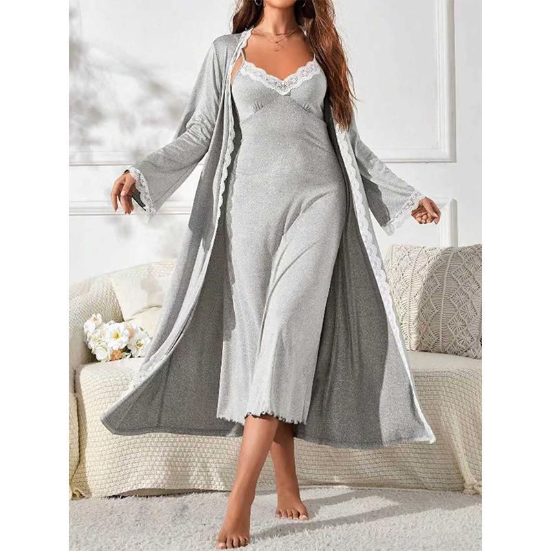 Indulge in luxurious comfort and allure with this stylish two-piece set, featuring a graceful nightdress and matching bathrobe. Made from soft milk silk, the set promises a soothing feel against your skin, enhanced by the opulent artificial silk material that adds an elegant touch. The intricate lace detailing elevates the ensemble, making it a perfect choice for those wanting both elegance and sensuality in their nighttime attire. Ideal for a serene evening at home or adding a touch of glamor to your nightwear collection.