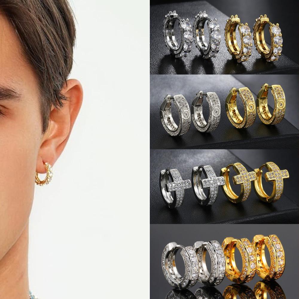 Hip Hop Full Diamond Big Ear Buckle Men'S Geometric Round Zircon Earrings Cross Rivets Hiphop Trend Earrings