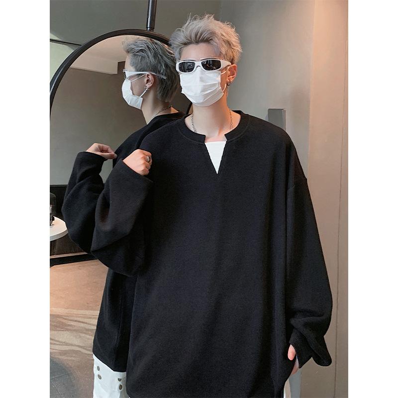 Two-piece Textured V-neck Sweatshirt for Autumn Handsome Trendy Long-sleeved T-shirt Top for Men