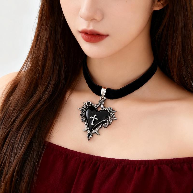 Gothic Halloween Heart Choker with Thorns, Velvet Rose, & Cross Pendant