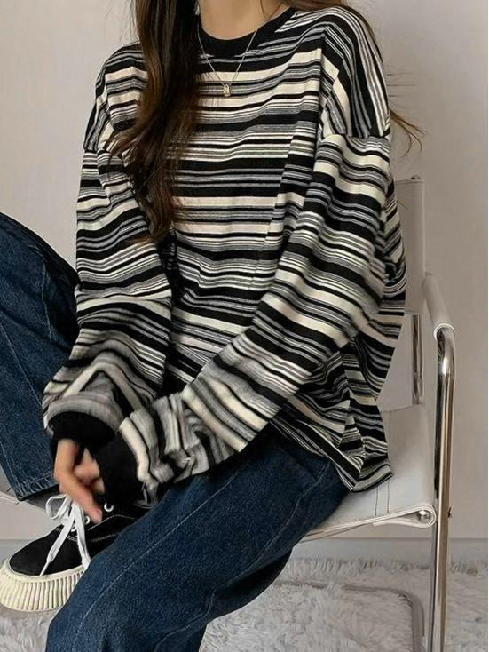 Korean Style Women's Striped Long-Sleeve Loose T-Shirt - Spring/Autumn Round Neck