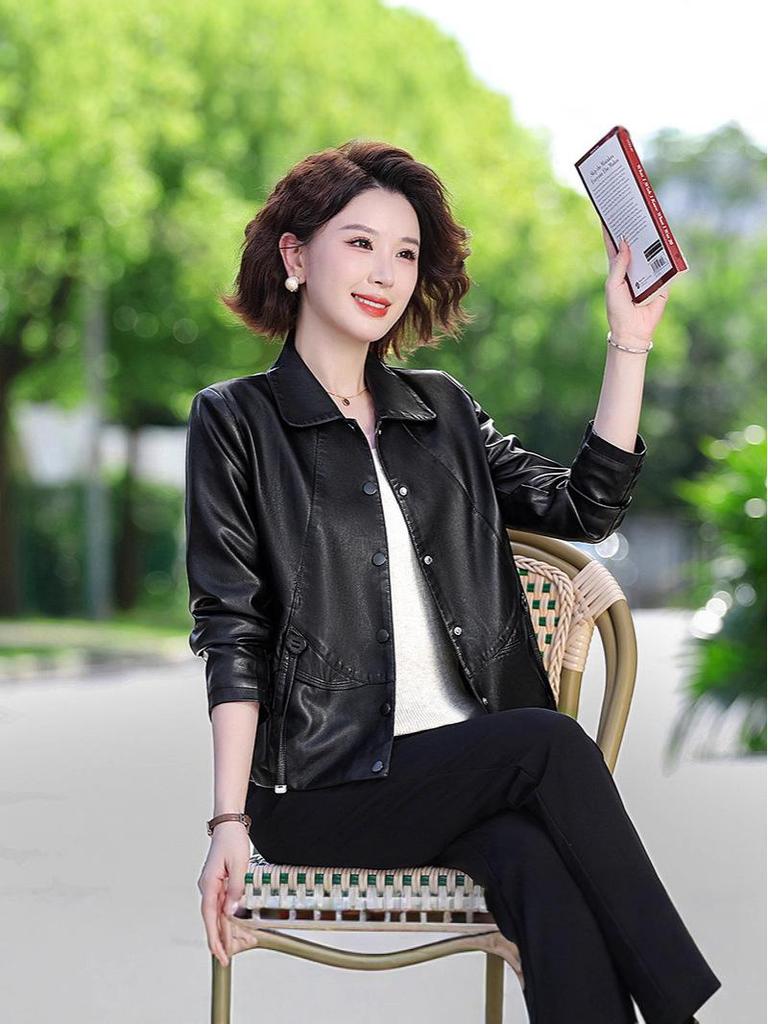 Introducing our stylish PU leather jacket, designed specifically for middle-aged and elderly women seeking a sophisticated yet contemporary look. This petite spring and autumn jacket features a refined tailor neckline and elegant long sleeves, perfect for adding a touch of class to any outfit. Crafted from high-quality polyurethane material and washed leather, it combines durability with a sleek appearance, ensuring both comfort and style. Ideal for a chic outing, this jacket effortlessly complements your wardrobe during the transitional seasons.