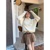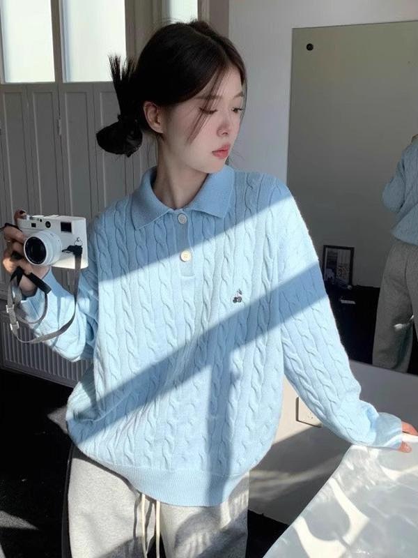 American Retro Polo Collar Sweater for Women - Blue Cable Knit Autumn Winter Top