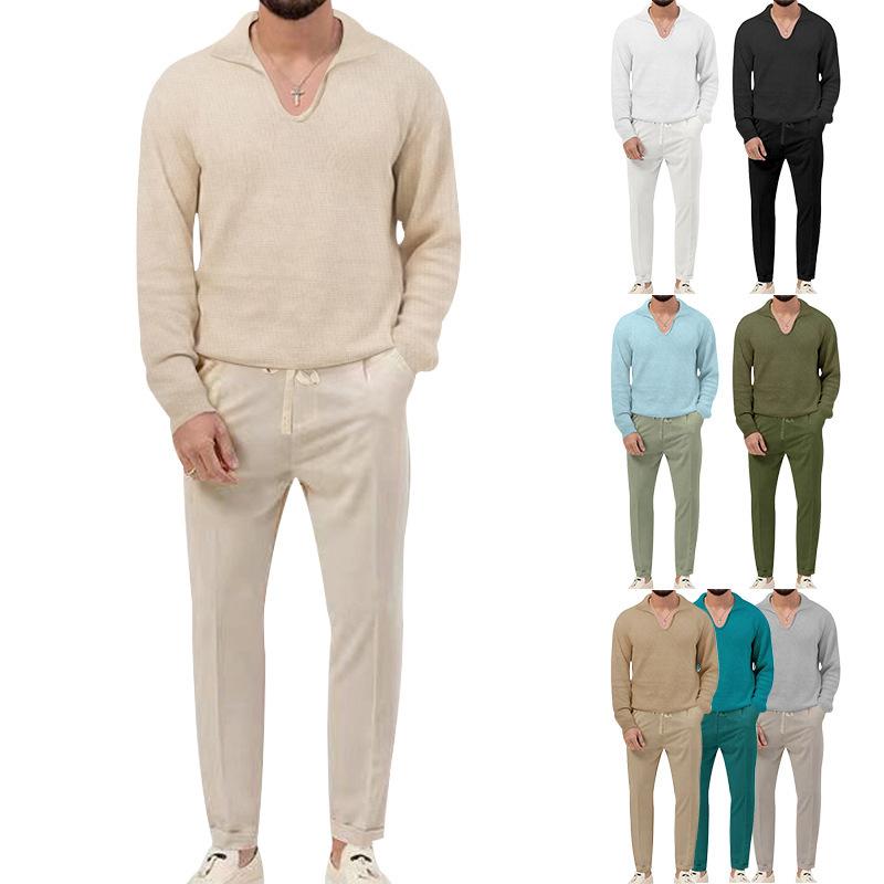 Autumn/Winter New Arrival: Men's Waffle Weave Casual Long-Sleeved Top and Trousers Two-Piece Set