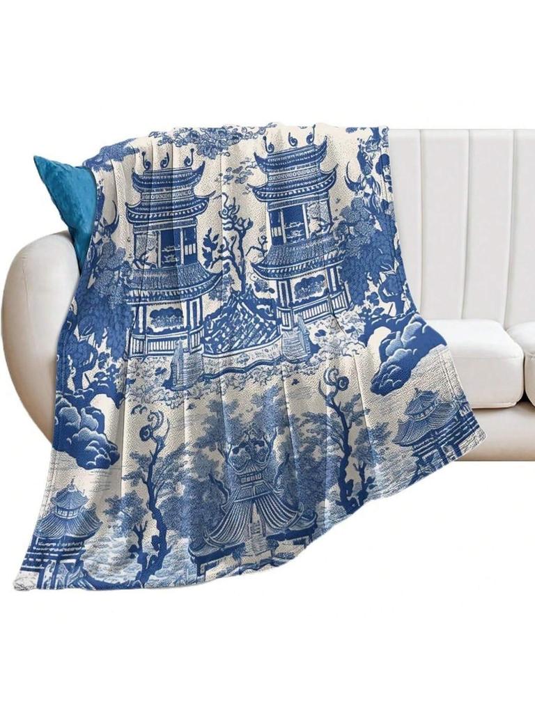 Throw Blanket For Couch Office Bed Blue And White Porcelain Chinese Style Building Pattern Lightweight Plush Fuzzy Cozy Soft Blankets And Throws