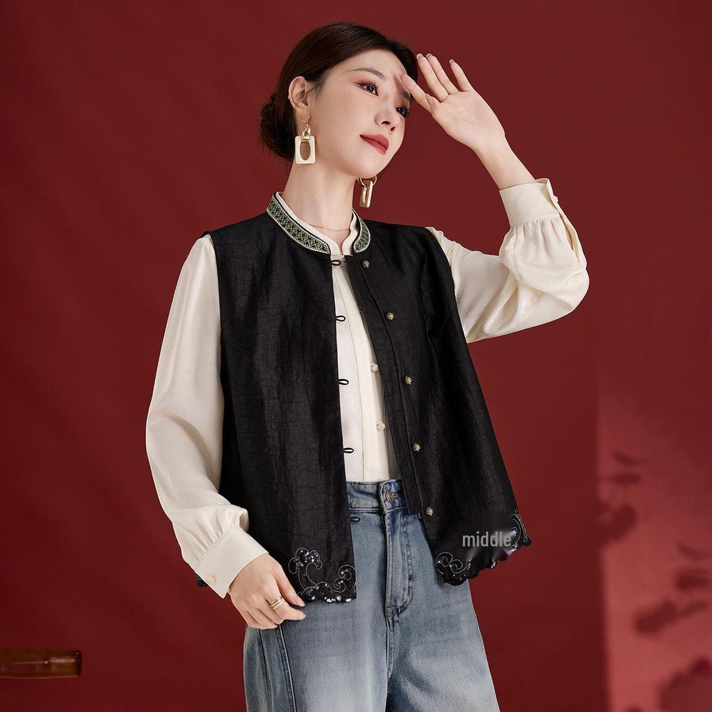 This sleeveless vest combines sporty elegance with a distinctive charm, featuring a stand neckline and delicate lace decoration. Crafted from artificial silk material, it offers a luxurious feel while being durable and versatile. The heavyweight mulberry silk xiangyun yarn with embroidery adds an artistic flair, while the unique craquelure fur material provides an exquisite texture. Designed for women who appreciate both style and comfort, this vest is perfect for making a statement in any casual or active setting.