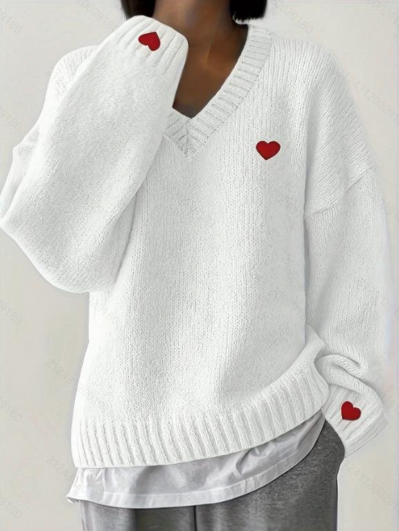 European American Love Embroidery V-Neck Sweater: Stylish Loose-Fit Pullover Knitwear