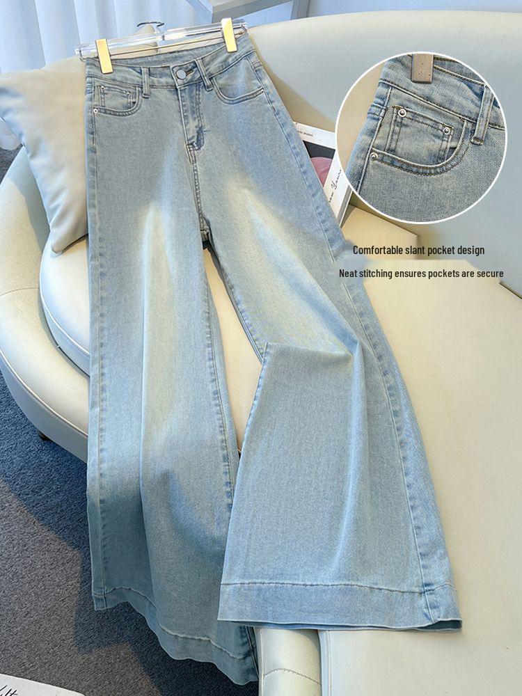 Embrace contemporary style with these high waist wide leg flared jeans, perfect for pear-shaped women. Crafted from premium denim cotton, these jeans offer a comfortable yet durable wear. The light color exudes a refreshing vibe, ideal for the transitional spring and autumn months. Designed to reach floor-length, they create a flattering silhouette that accentuates the waist while providing a chic, laid-back aesthetic.