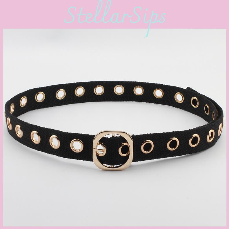 This unisex fabric belt features a hollow design and a sleek gold buckle, combining street style with practicality. with a single loop and needle clasp for secure fit. Ideal for casual wear and daily outfits, it enhances street fashion. Wipe clean with a damp cloth to maintain its appearance.