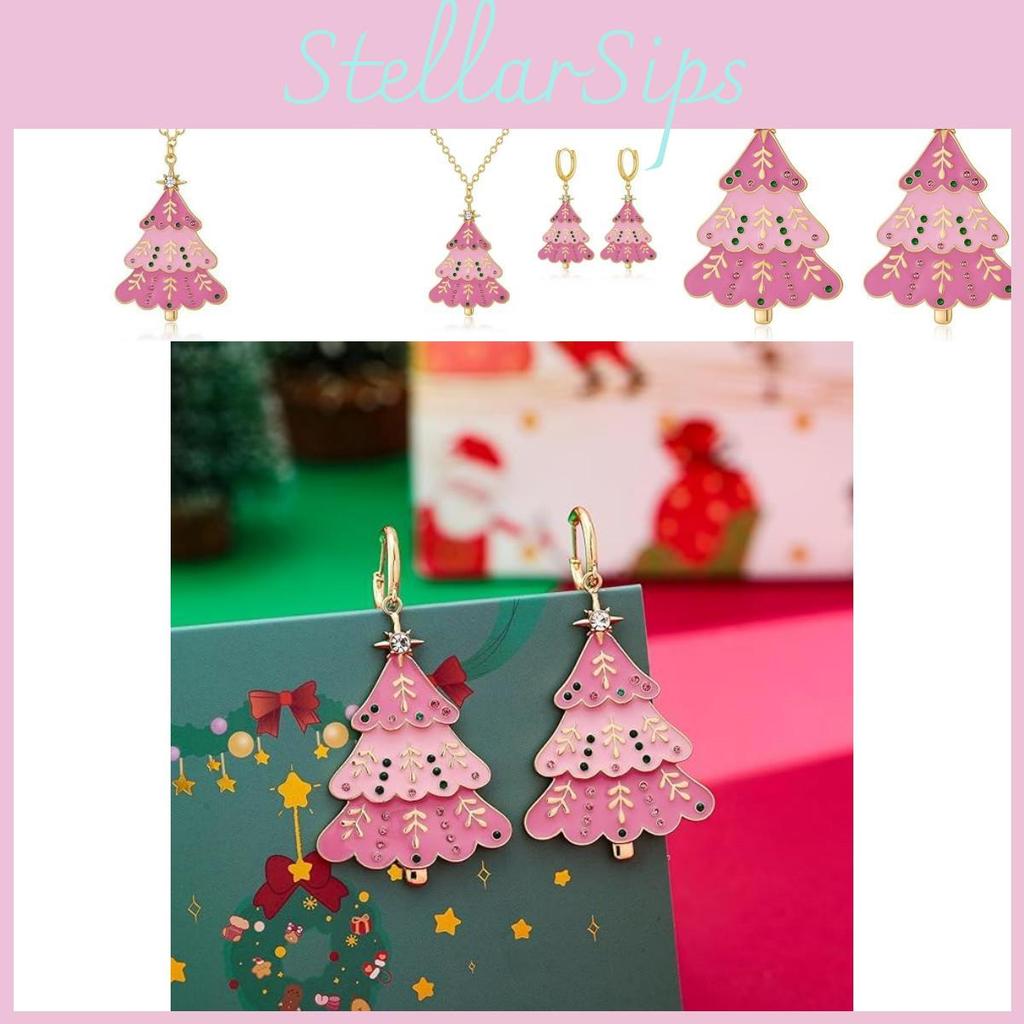 Premium Alloy Pink Christmas Tree Earrings And Necklace Set Perfect For Gatherings Holiday