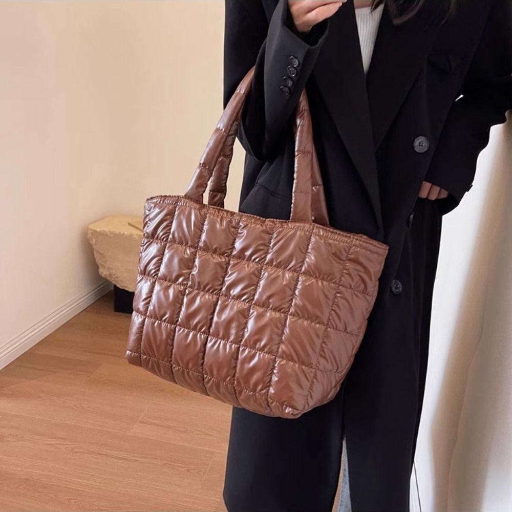 Checkered Cotton-padded Tote Bag Korean Style Puffy Bag Down Cotton Shoulder Bag Office Worker