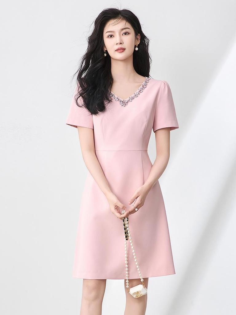 Elevate your summer wardrobe with this elegant short sleeve dress, designed in a chic French style. Crafted from high-quality polyester, it features a flattering V-neckline adorned with sparkling rhinestones, adding a touch of glamour to any occasion. Perfect for those warm days and breezy evenings, this dress combines comfort and sophistication for the modern woman.