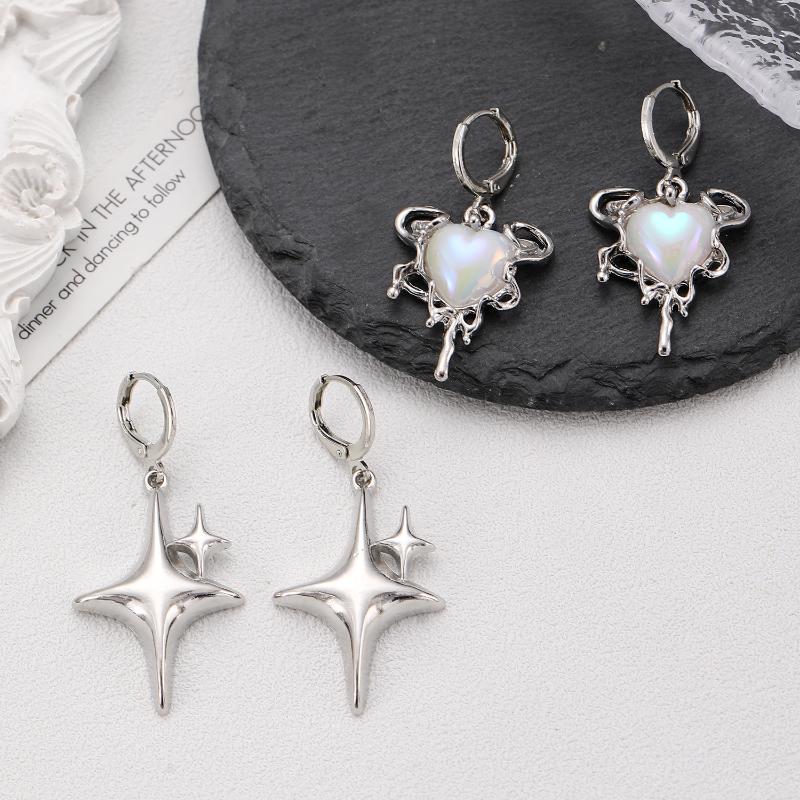 Simple Silver Color Star Earrings For Women Girls Opal Stone Heart Hoop Earrings Punk Y2K Cute Daily Wear Jewelry Party Gifts