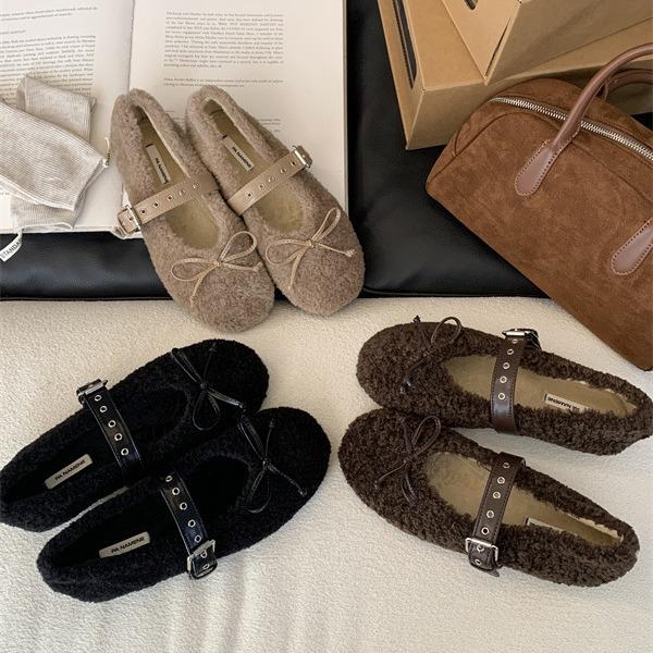 2025 Autumn and Winter Comfortable Versatile Bow Cotton Shoes Round Head One-word Buckle Casual Fluffy Shoes