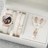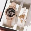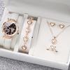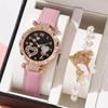Elegant Crystal Heart Butterfly Bracelet & Leather Strap Quartz Watch with Pink Gemstone Set