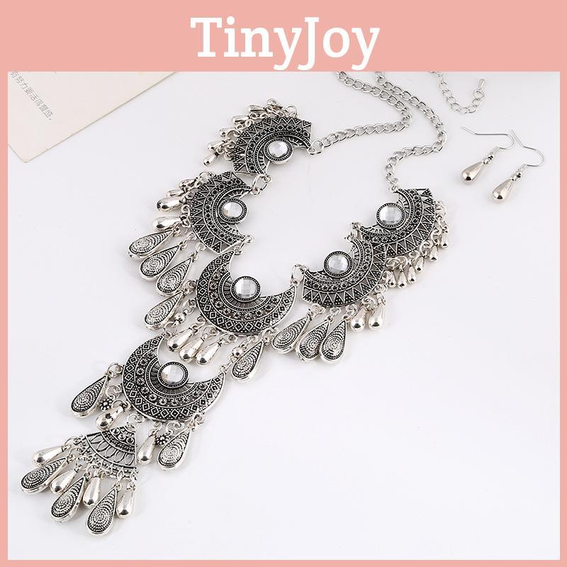 This vintage-style necklace set features a waterdrop-shaped pendant crafted from alloy with electroplating for a durable finish. The multi-layer design includes a black or white color option, suitable for versatile styling. Ideal for fashion enthusiasts, it complements retro or artistic outfits. Wipe clean with a soft cloth to maintain its shine.