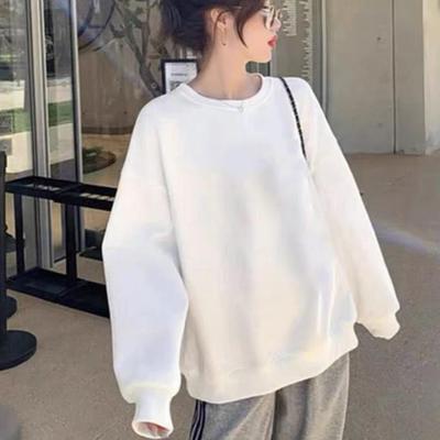 Women's White Korean-Style Crew Neck Pullover Sweatshirt - Pure Cotton, Trendy for Spring/Autumn 2024