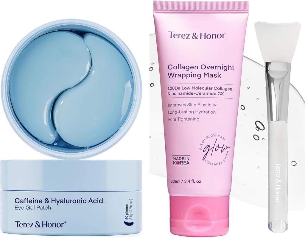 Terez & Honor Caffeine Eye Gel Patch and Overnight Wrapping Mask Set, Eye Gel Patch, Hyaluronic Acid Patch, Eye Care, Eye Pack, Eye Mask Sheet, Korean Cosmetics (Blue/Pink) Set