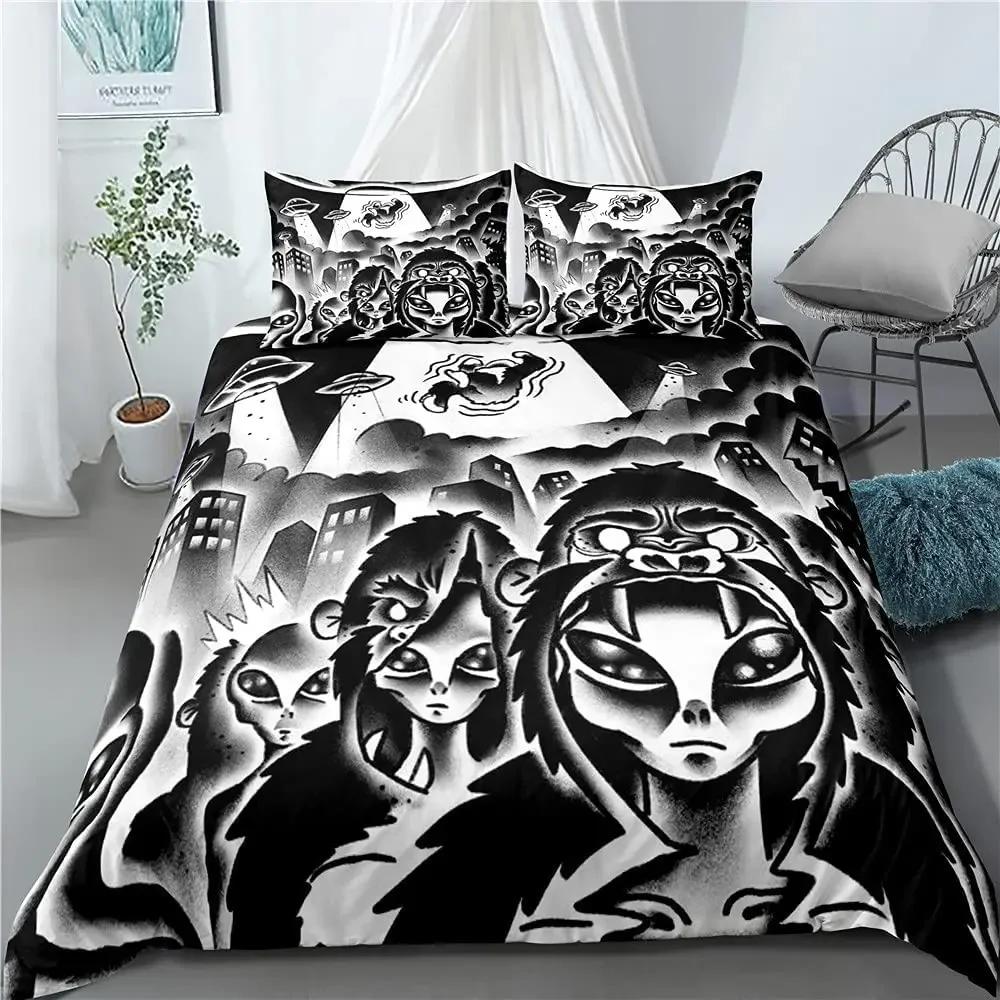 Alien UFO Duvet Cover Queen Boys Kids Supernatural Martiansal Beings From Other Planets Head of An Alien Polyester Qulit Cover