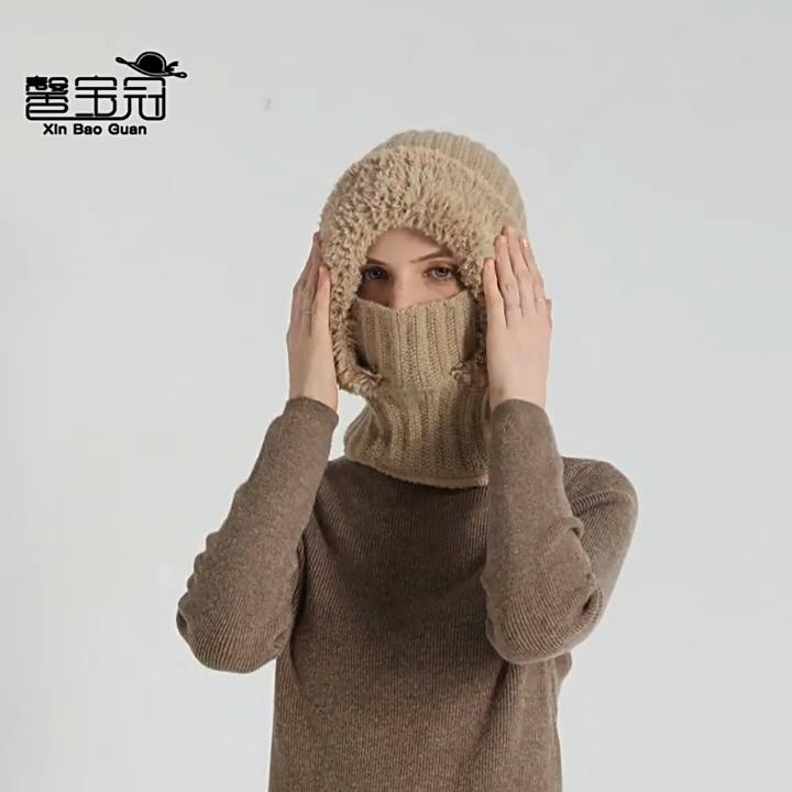 Women's Knitted Hat with Scarf and Mask Set, Winter Warm Fleece Riding Windproof Wool Hat