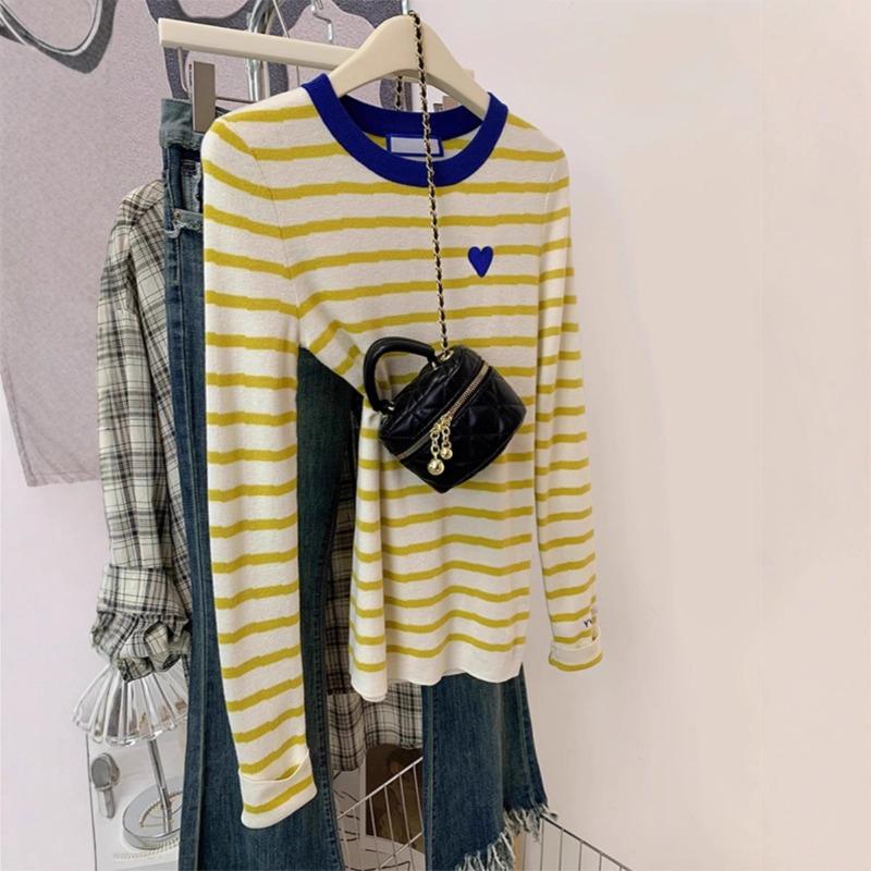 Yellow Love Striped Knitted Long-sleeved Shirt Women's Early Spring Design Sense Niche Slim-fitting Front Shoulder Top Small Man