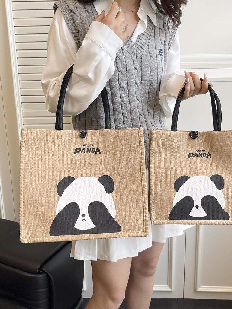 Portable Large-Capacity Panda Tote Bag - Retro Linen Shopping & Travel Shoulder Bag