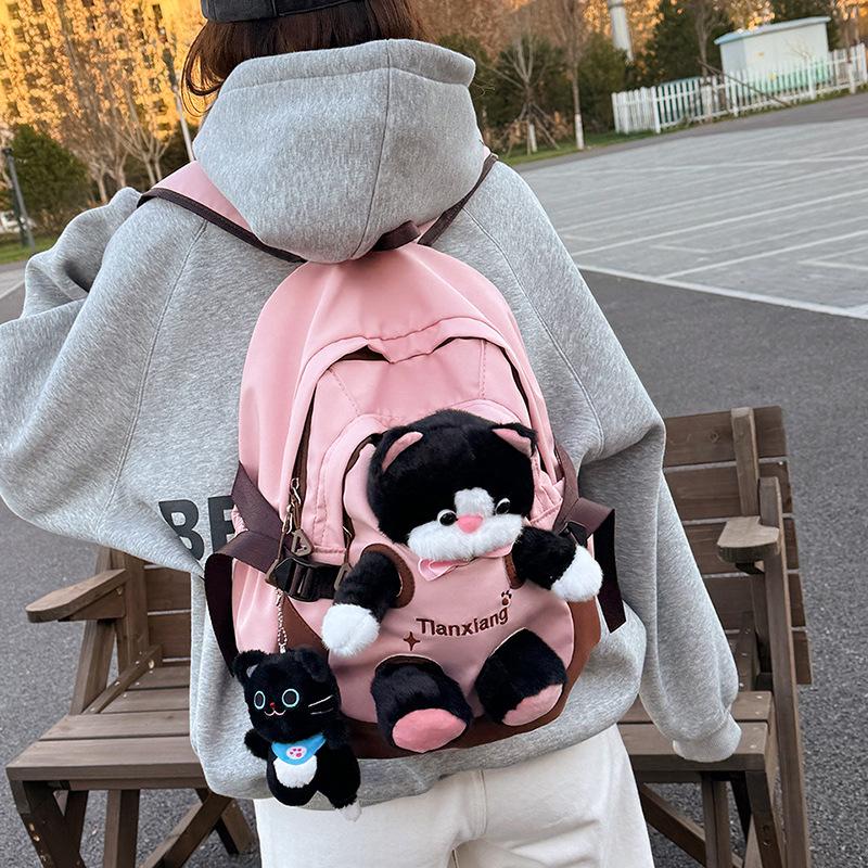 Cute Kitten Color-Block Cartoon Plush Schoolbag - Large Capacity Backpack for Female College Students