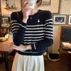 Chic Temperament Early Autumn Crew Neck Retro High-end Striped Embroidered Inner Long-sleeved Knitted Bottoming Shirt Women's Top