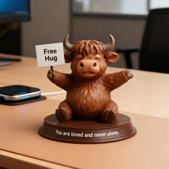 Add charm and humor to any space with these compact resin highland cow figurines. Crafted from high-quality resin, each piece features exquisite detailing and a smooth finish, making them perfect for desks, shelves, or tabletops without cluttering your room. These playful companions hold signs with witty messages like "Free Hug" and "Your Anxiety is A Lying Hoe," delivering relatable humor that sparks smiles and lightens moods.
