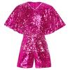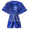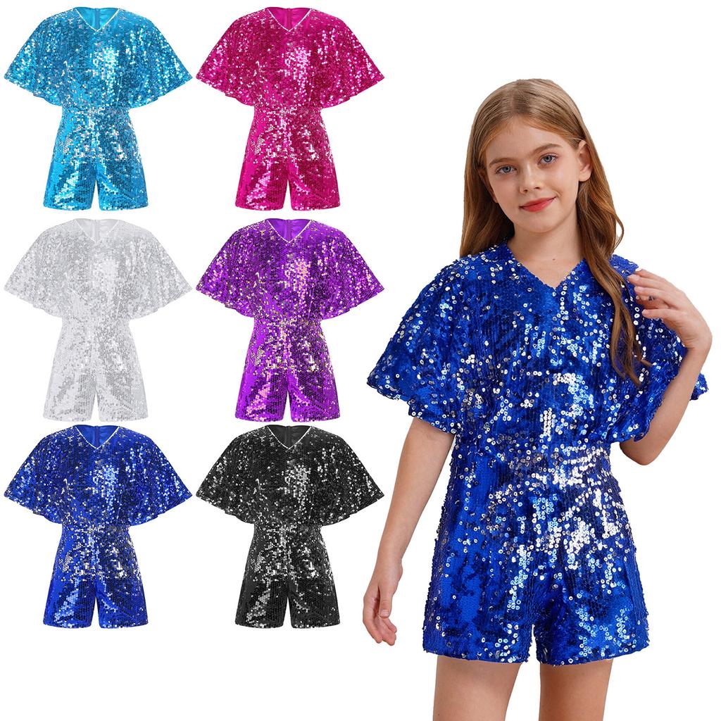 Girls Sparkling Sequins Jumpsuit V Neck Cap Sleeve Bodysuit Birthday Party Stage Performance Costume