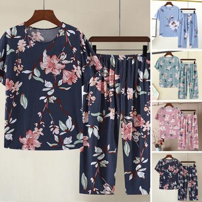 2 Pcs/Set Mid-aged Women Pajamas Set O Neck Flower Print Short Sleeve Elastic Waist Pleated Loose Thin Wide Leg Soft Mother Sleepwear Top Pants Set