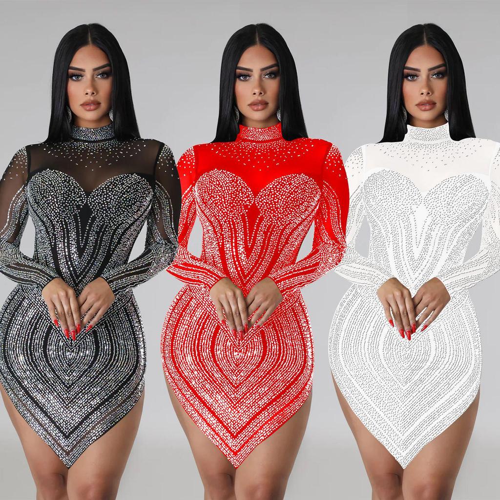 Elevate your wardrobe with this elegant mini dress featuring a blend of European and American fashion influences. Crafted from high-quality polyester, this long sleeve dress boasts a solid color design adorned with delicate rhinestone embellishments, adding a touch of glamour to its chic mesh fabric. Perfect for special occasions or a night out, this dress combines comfort and style, making it a versatile addition to any fashion-forward woman's collection.