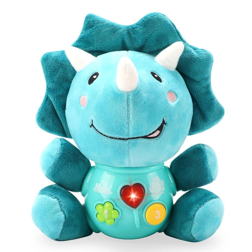 ♫【Dinosaur Plush Toy】Three buttons play bird and animal sounds, 12 nursery rhymes, and 6 sound effects (SFX). Shake the Triceratops to hear soft lights, baby groans, and laughter.