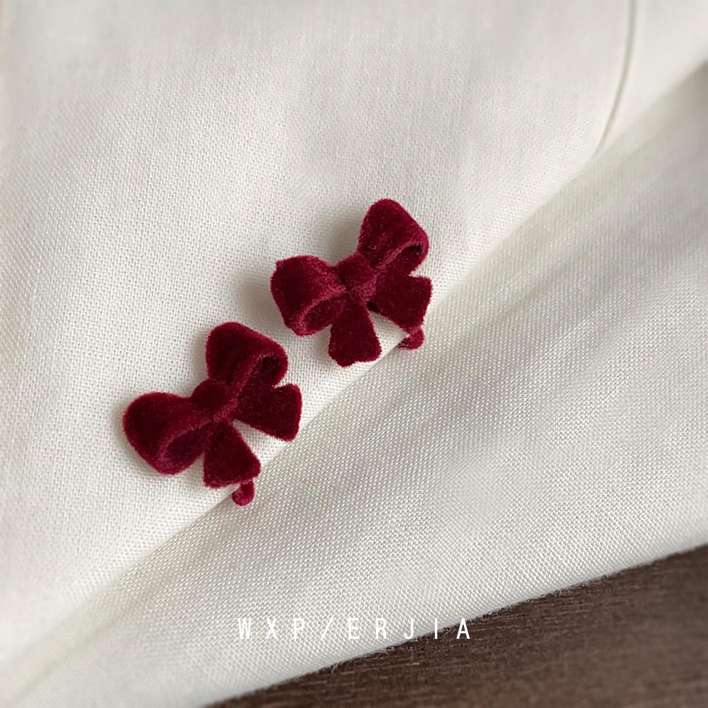 Christmas Red Flocked Bow French Retro Princess No Piercing Earrings
