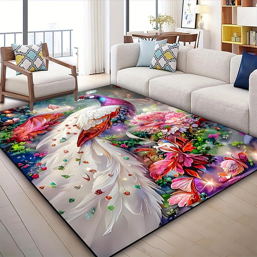 Golden Diamond Velvet Plush Area Mat Luxurious Peacock Floral Design Anti Slip Bottom Machine Washable Bedroom Dorm Living Room