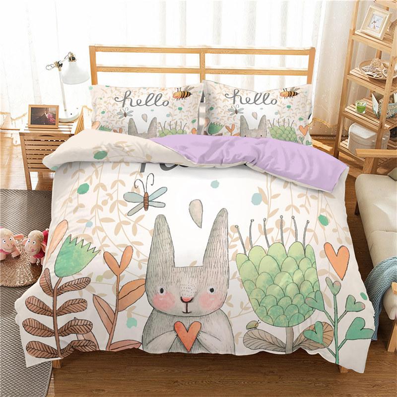 Cartoon Rabbit Bedding Set For Boys Girl Teen Botanical Plant Duvet Cover Microfiber Kawaii Bunny Comforter Cover Bedroom Decor