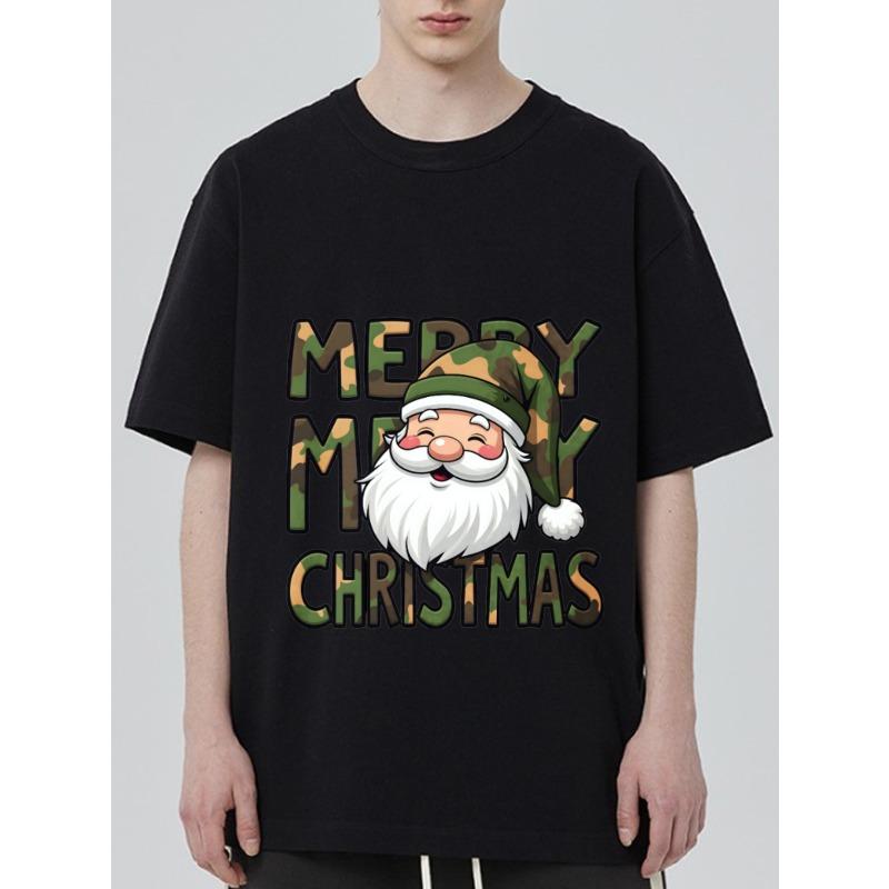 Christmas T-Shirt Black Camouflage Santa Claus Merry Christmas Print Holiday Party Wear