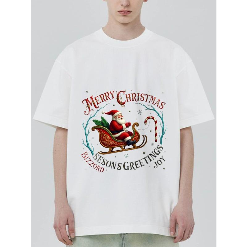Christmas T-Shirt Black Santa Claus Sleigh and Candy Cane Print Merry Christmas Seasons Greetings Joy Text Design for Holiday Party Casual Wear