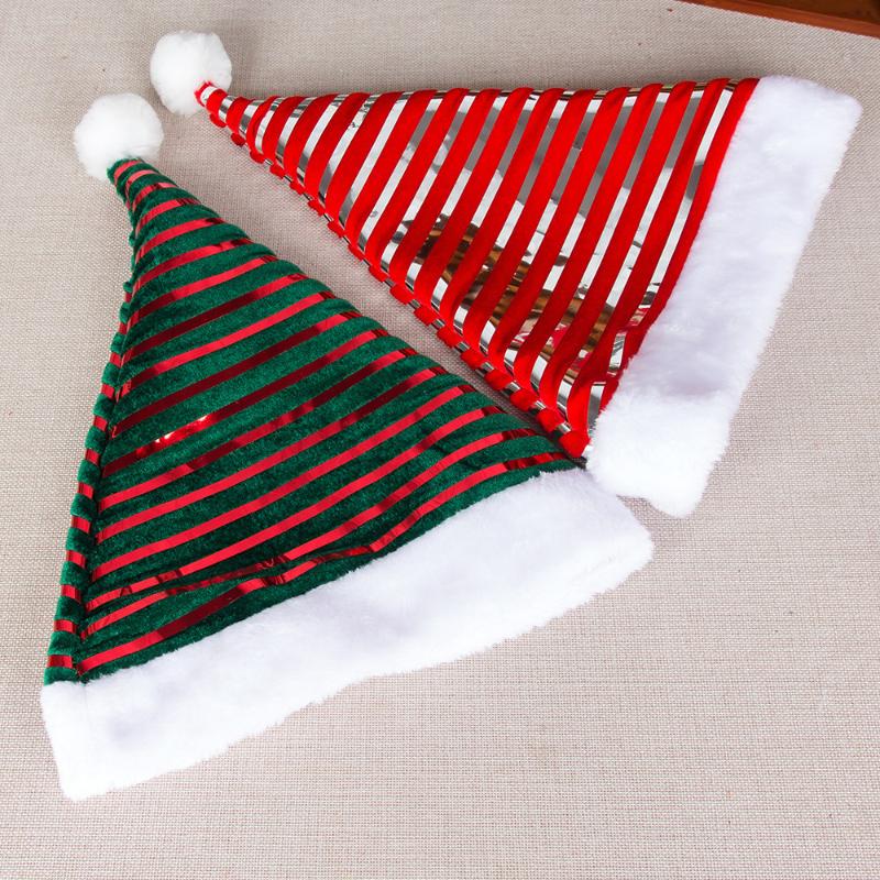 Christmas Hats With Shiny Stripes Red & Green Velvet Santa Caps Festive Headwear Decoration