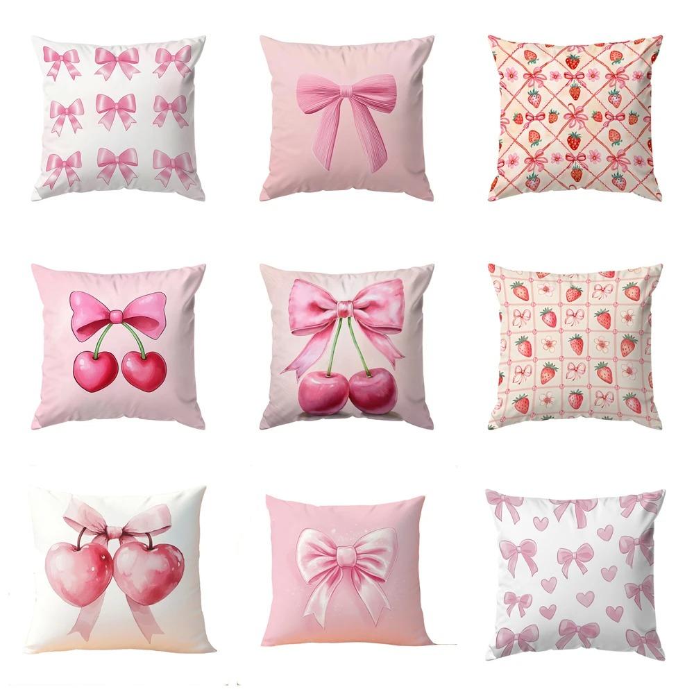 Soft Pink Bow & Cherry Blossom Pillow Cover 45x45cm - Floral Printed Pillow Case for Sofa Living Room, Home Decor Pillow Cover