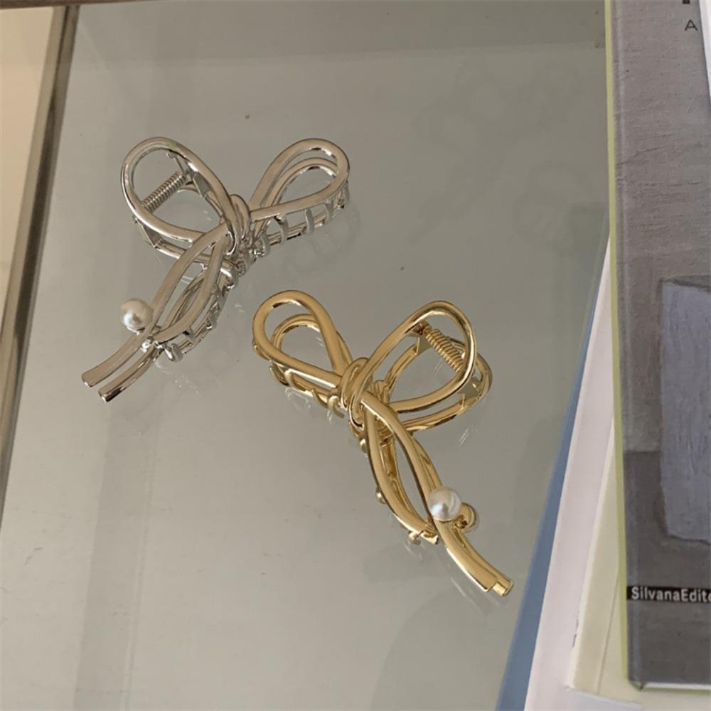 1pc Fashion Elegant Bow Shaped Metallic Hair Claw Pearl Accent Designs Perfect for Sweet Daily Looks Romantic Styles Accessories