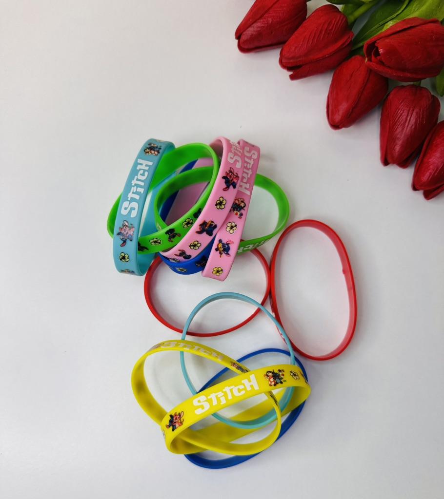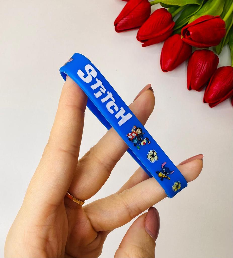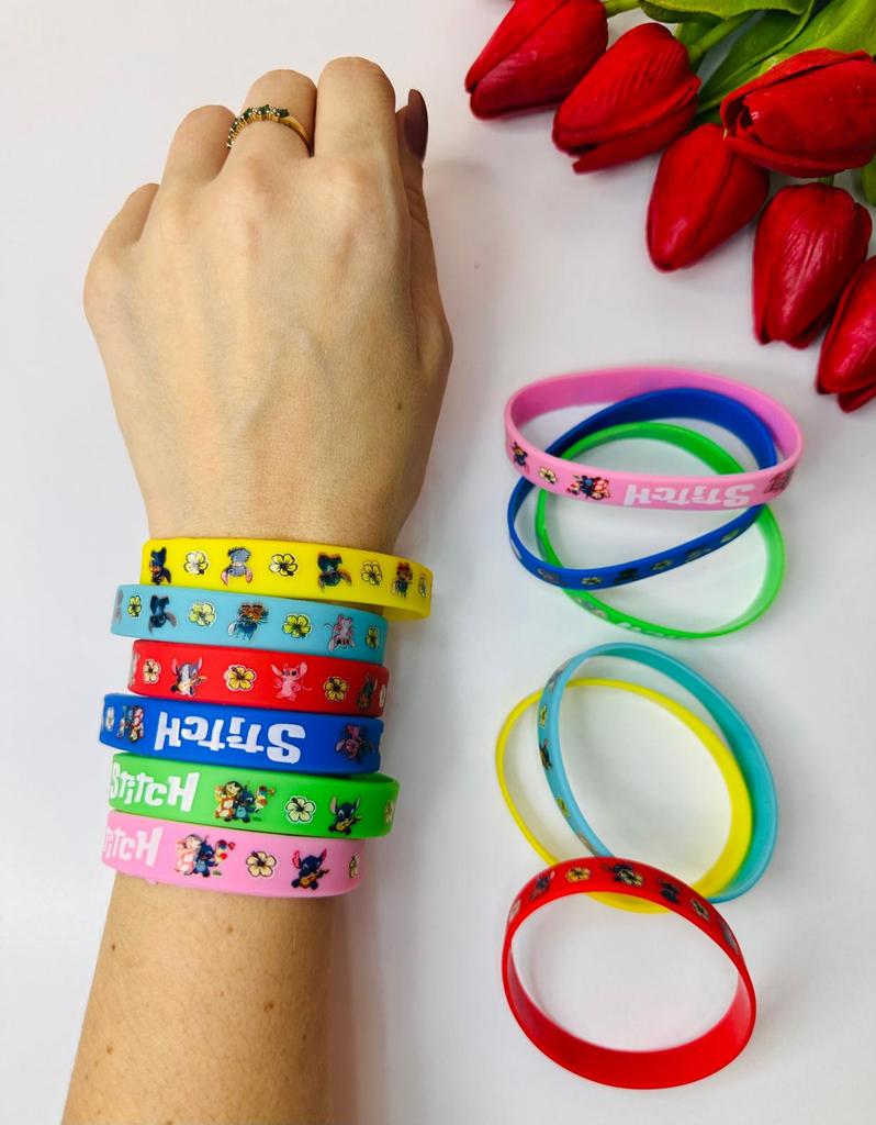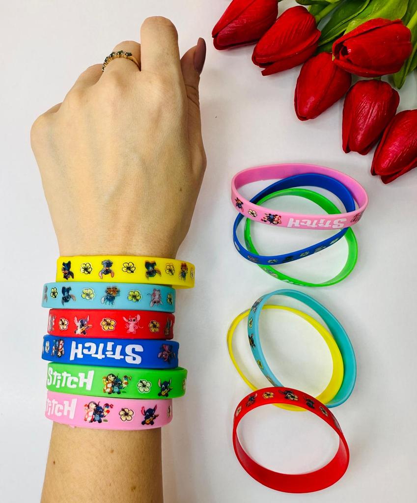 Colorful Design: The set includes a variety of vibrant colors such as pink, blue, green, yellow, and red. Stitch Theme: Each bracelet features graphics of the character Stitch along with tropical flowers and the name "Stitch" in a stylized font. Material: They are made of flexible and soft silicone, which makes them water-resistant and comfortable for daily use. Versatility: They are perfect as details for birthday parties, gifts for guests or simply to exchange with friends.